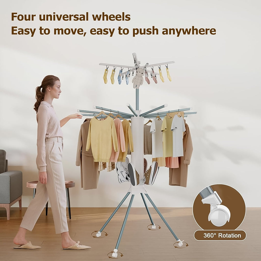 clothes drying rack, foldable drying stand, collapsible laundry rack, rotating clothes hanger stand, multipurpose drying rack, portable laundry drying stand, shoe drying rack, sock hanger rack, heavy duty drying stand,balcony clothes rack,rotatable drying rack, foldable rotary clothes stand, tripod clothes drying stand