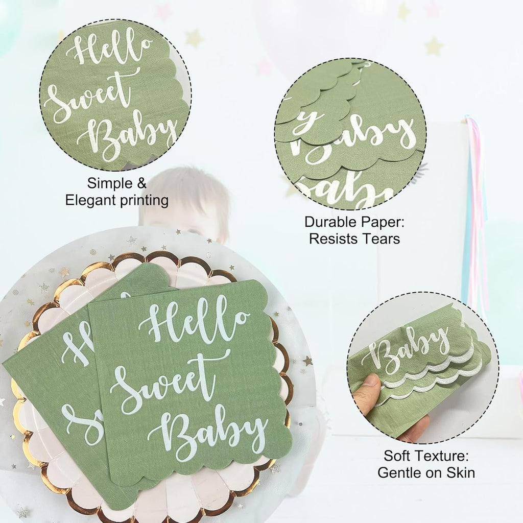 Hello Sweet Baby Party Paper Napkins – 24 Pc Disposable Table Napkins with Scalloped Edges – Soft, Absorbent Mint Green Tissue for Baby Shower, Birthday Party, and Celebration Décor (31 x 31 cm)
