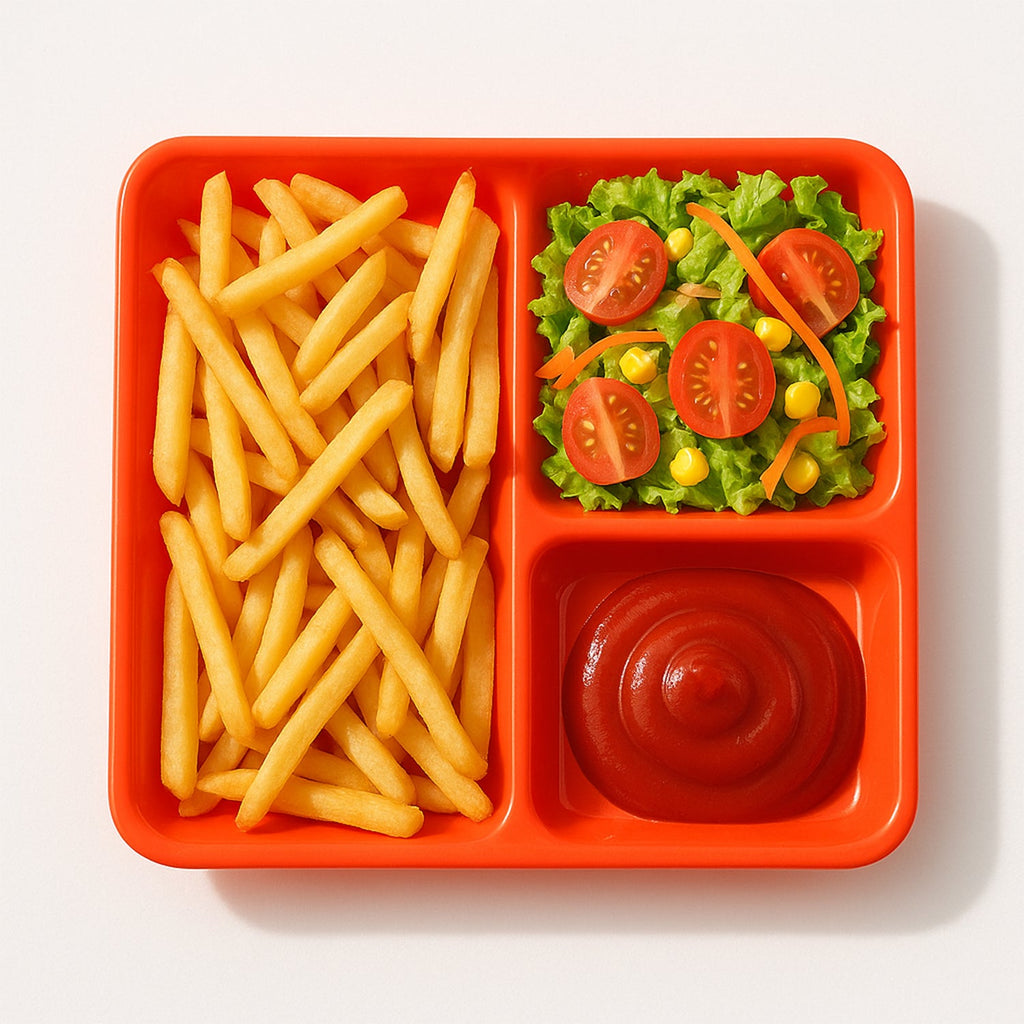 Three fixed compartments for organized plating of mains, sides, and condiments