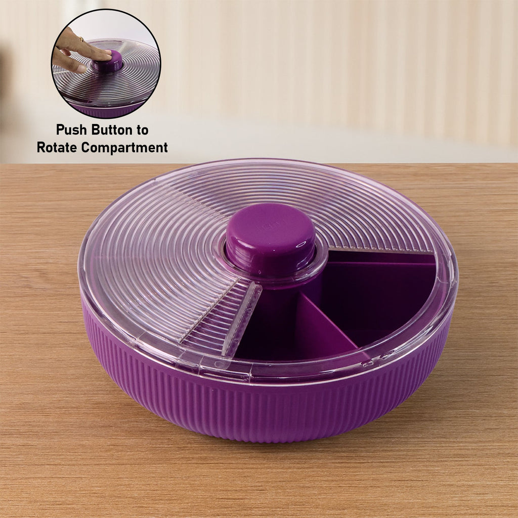 rotating dry fruit container , snack storage box , round organizer box , multipurpose storage container , dry fruit serving box , divided snack box , purple snack box , dry fruit and chocolate box , rotating serving tray , snack box for guests , plastic dry fruit container
