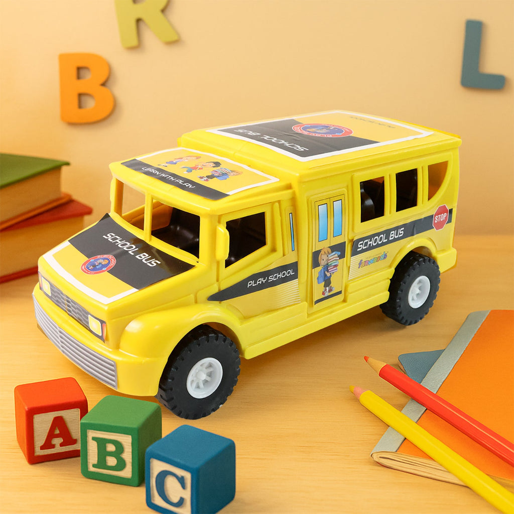 Funwoods , friction powered school bus , school bus toy , push and go vehicle , toy bus for kids , safe rounded edges toy , durable toy bus , pretend play vehicle , role-play toy, funwoods school bus , sturdy wheels toy , kids learning toy , preschool toy